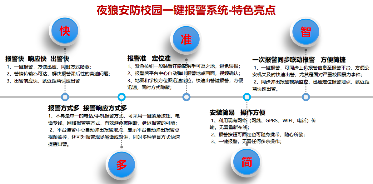 夜狼安防不忘初心,牢记“为安全守望 助社会安宁”使命,成立20多年来,立足安防领域,致力于提供周全系统的安防智能解决方案。校园作为下一代成长的摇篮,我们更要加强校园安全的事前防范与事发紧急报警,全心呵护学生健康快乐成长,在此过程中,夜狼安防作为世界安防领域的重要一员,努力为创造安全的校园环境做出我们安防人的贡献!